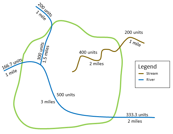 سيناريو من الحياة الواقعية يُستَخدَم فيه هذا التحليل يحدد إجمالي حجم الماء في الأنهار ضمن حدود متنزه الولاية. يمثل كل خط نهرًا يقع جزئيًا داخل المنتزه. أظهرت النتائج أن هناك 6.5 ميلًا من الأنهار داخل المنتزه ويبلغ الحجم الإجمالي 1200 وحدة.