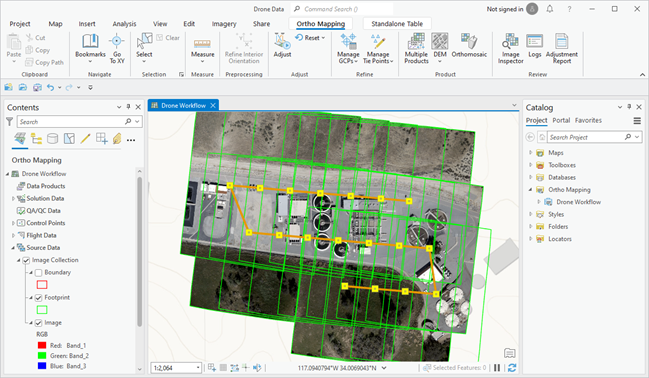 Ortho-Mapping in ArcGIS AllSource stellt Werkzeuge, Funktionen und geführte Workflows zum Durchführen einer strengen Orthorektifizierung von Drohnen-, Luft- und Satellitenbilddaten bereit. Dies sind Projekteinrichtung, Definition von Passpunkten, Verknüpfungspunkten und Prüfpunkten, Blockausgleichung und Produkterstellung zur Generierung von Höhen- und Orthomosaik-Produkten. Berichte und visuelle Diagramme stellen analytische und quantitative Informationen für die Optimierung bereit, um bei der Orthorektifizierung optimale Ergebnisse zu erreichen.