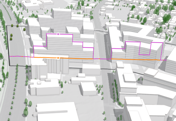 Die Sichtbarkeitslinienanalyse ermöglicht detaillierte Sichtbarkeitsprüfungen zwischen bestimmten Punkten, z. B. die Überprüfung einer unverstellten Aussicht von einem geplanten Balkon auf ein Landmark oder die Bewertung der Auswirkungen auf die Privatsphäre zwischen Gebäuden.