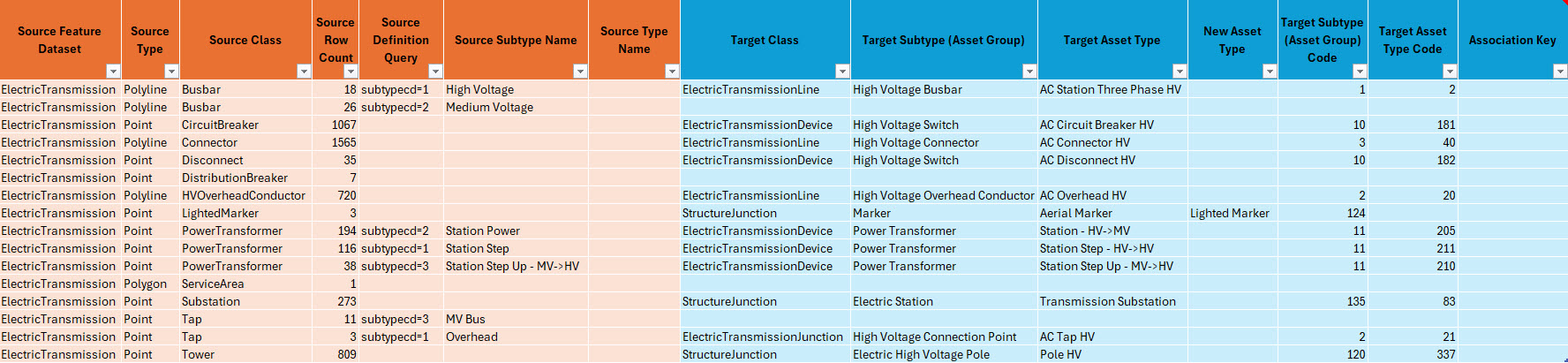 By completing the mapping spreadsheet, you identified areas in the target database that required the schema to be extended. You successfully added a new asset type directly in the mapping sheet for Lighted Marker. The only unmapped items that remain are Busbar (Medium Voltage), DistributionBreaker, Tap (MV Bus), and ServiceArea. You will map ServiceArea later, so you will ignore that feature class for now. For the others, you will expand the schema in a subsequent workflow.