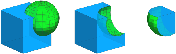 Operand A is a closed cube, while operand B is a 2D quad. Left: The quad fully cuts the cube. Everything below the plane is regarded as "inside" and thus disappears. Right: The quad only partially cuts the cube. | ![]() |