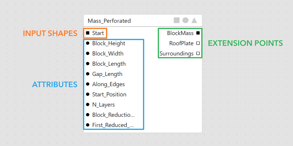 - Extension slots—These slots represent the component’s extension point shapes. Empty white slots mean that no geometry is generated for that extension unless it is connected to another node.