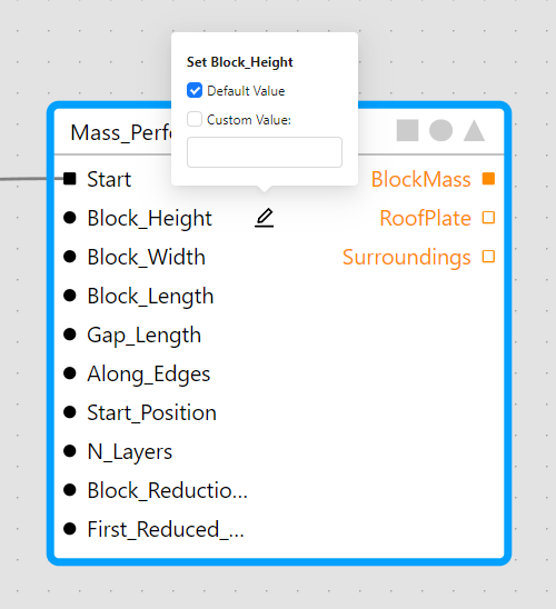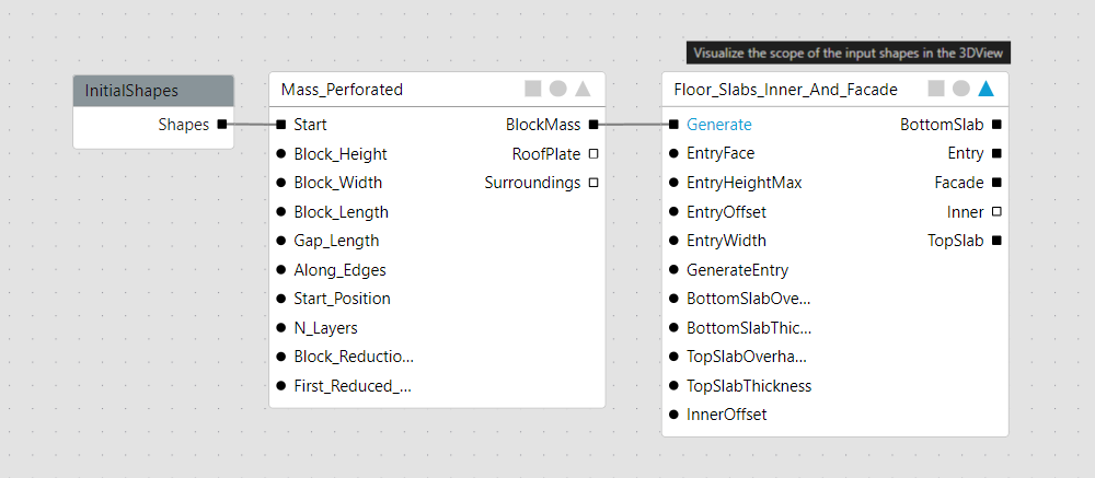 The Visual CGA Editor utilizes a node-based system in which nodes are connected to implement procedural designs. Each node has input and output slots, in which circular slots represent values and square slots represent shapes.