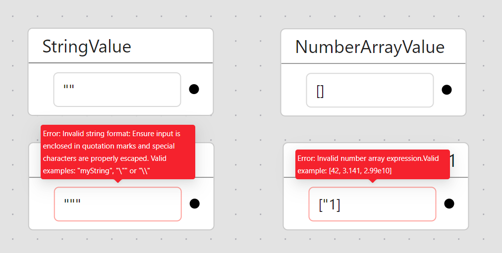 Input nodes validate the entered values. If validation fails, an error is displayed based on the node's type. An explanatory pop-up provides details about why the validation failed.