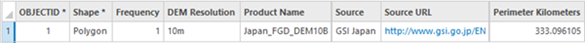 - Three additional fields are returned that identify the Terrain source data used in the calculation. The Product Name field identifies the data product used in the analysis. The Source and Source URL fields give further details about the provider of the data.