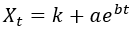 , donde Xt es el valor de la serie temporal en el tiempo t, y a, b y k se estiman a partir de los datos utilizando una estimación de mínimos cuadrados. El valor k permite que la curva exponencial cambie para ajustarse mejor a la serie temporal. - Aplicación potencial: el tipo de curva exponencial es útil para datos que aumentan o disminuyen rápidamente con el tiempo. Por ejemplo, los periodos de rápido crecimiento de la población en regiones en desarrollo se pueden modelar con una curva exponencial.