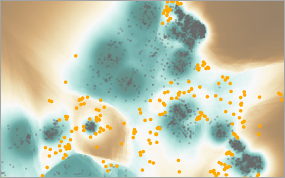 La herramienta proporciona una capa de entidades de salida que resalta las entidades designadas como valores atípicos espaciales. Los valores atípicos se simbolizan en naranja, y los inliers se simbolizan en gris semitransparente, lo que permite evaluar visualmente la densidad espacial de los inliers.