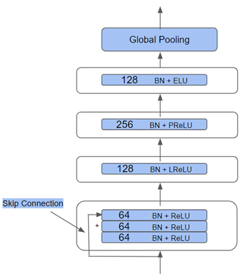 Esta red es una combinación de ResNet y las redes neuronales convolucionales. A la red se agrega una sola conexión de salto para mejorar la transferencia de información. Para solucionar el sobreajuste debido a las conexiones de salto en todos los bloques residuales, esta arquitectura utiliza una conexión en el primer bloque solamente, como se muestra en la figura siguiente. Se utiliza una serie de funciones de activación heterogénea, como ReLU, LReLU, PReLU y ELU, en diferentes capas para lograr una abstracción aceptable [2].