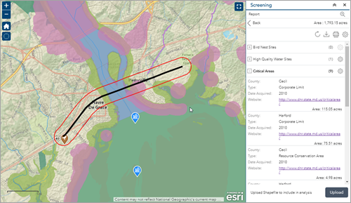 El widget Selección le permite definir un área de interés y analizar capas especificadas para detectar posibles efectos negativos. El área de interés se puede definir a través de una búsqueda de nombres de lugar, mediante un dibujo en el mapa, mediante la carga de un shapefile o mediante la introducción de un trazado poligonal con pares de coordenadas y distancia. Los resultados del análisis pueden inspeccionarse en el widget y, opcionalmente, compartirse mediante un informe impreso, una descarga de archivo CSV o una descarga de entidades.