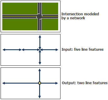 | Jeu de données réseau fusionné en sortie | Jeu de données réseau avec moins d’entités linéaires, impliquant des analyses de réseau plus rapides. | Jeu de données réseau |
