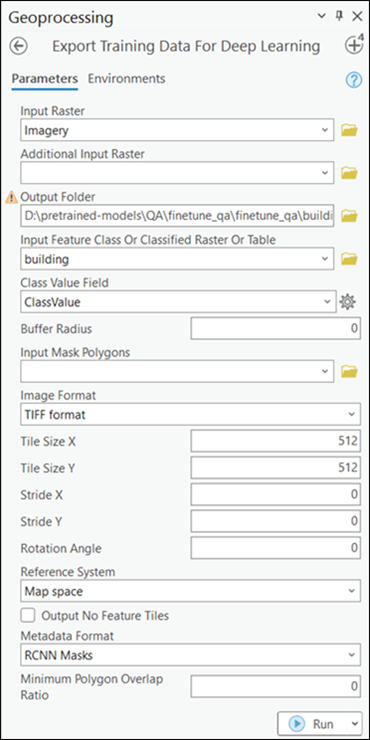 Vous pouvez préparer les données d’entraînement à l’aide de l’outil Export Training Data For Deep Learning (Exporter les données d’apprentissage pour Deep Learning). Ensuite, vous pouvez optimiser ce modèle sur vos données à l’aide de l’outil Entraîner le modèle de Deep Learning dans ArcGIS Pro. Suivez la procédure ci-dessous pour optimiser le modèle.