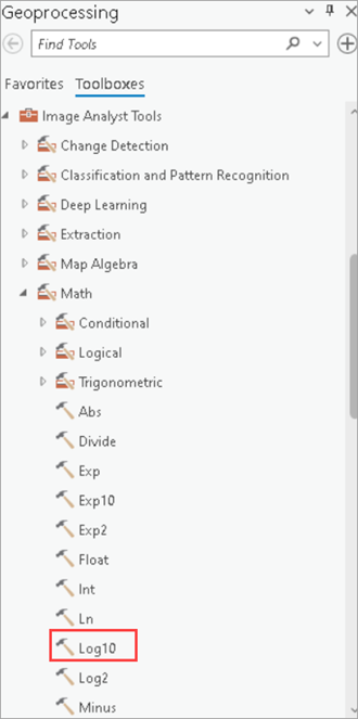 - Cliquez sur l’onglet Toolboxes (Boîtes à outils) dans la fenêtre Geoprocessing (Géotraitement), sélectionnez Image Analyst Tools (Outils Image Analyst) et recherchez l’outil Log10 sous Math (Mathématiques).