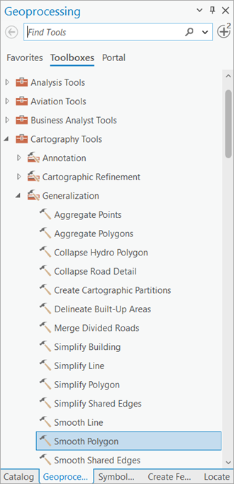 - Cliquez sur l’onglet Toolboxes (Boîtes à outils) dans la fenêtre Geoprocessing (Géotraitement), développez Cartography Tools (Outils de cartographie) et recherchez l’outil Smooth Polygon (Lisser un polygone) sous Generalization (Généralisation).