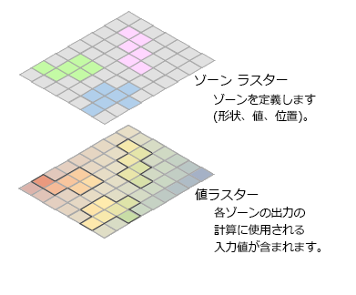 ゾーン統計の動作は、別のデータセットによって定義されたゾーン内のラスター (値ラスター) のセル値に対して統計情報を計算します。 ゾーン別に統計情報を計算する、[ゾーン統計 (Zonal Statistics)] および [ゾーン統計をテーブルに出力 (Zonal Statistics as Table)] という 2 つのツールが存在します。