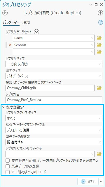 [新しいファイル ジオデータベース] パラメーターは、一方向およびチェックアウト レプリカでのみ有効です。