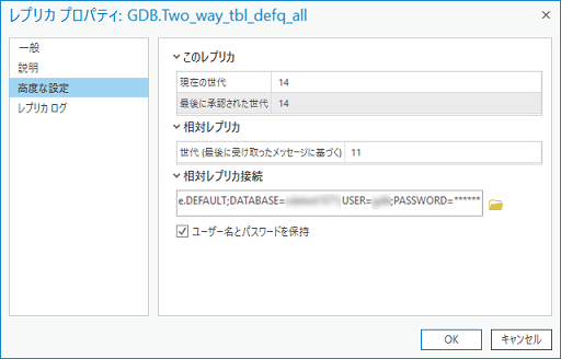 [レプリカ プロパティ] ダイアログ ボックスの [高度な設定] タブには、該当するレプリカに関連した世代番号の情報が表示されます。 世代番号は、レプリカとの間で送受信されたメッセージを追跡するためにジオデータベースで保持される番号です。