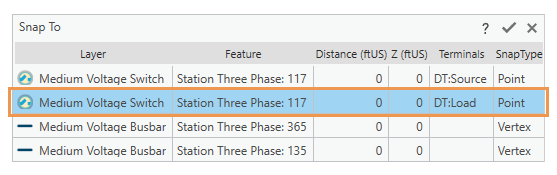 - [スナップ先] ポップアップ ウィンドウでターゲット フィーチャの行をクリックします。