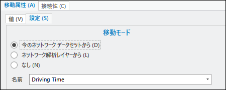 [移動モード] セクションでは、ネットワーク データセットかネットワーク解析レイヤーから移動モードのソースを取得するよう選択できます。