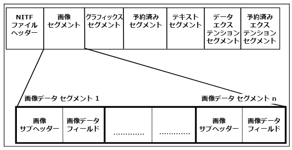 NITF は、基本的なファイル ヘッダーとさまざまなデータ タイプ セグメントで構成されています。 データ エクステンション セグメント (DES) とタグ付きレコード エクステンション (TRE) を使用して、データとプロパティがさらに記述されます。