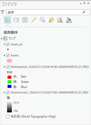WorldView-2 衛星画像 (この画像は DigitalGlobe 社の許可を得て掲載しています) - [コンテンツ] ウィンドウに 5 つのレイヤーが表示されていることを確認します。