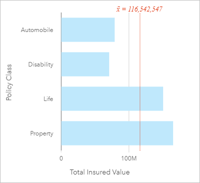 각 막대의 값은 y축의 각 범주별 피처 수 또는 숫자 필드나 비율 필드로 심볼화할 수 있습니다. 한 필드를 사용하는 경우 해당 막대 값은 각 범주의 해당 필드 값에 대한 합계, 최소값, 최대값, 평균, 백분위수, 중앙값으로 계산될 수 있습니다.
