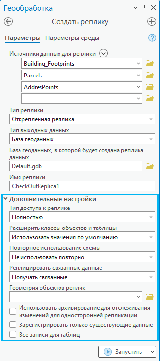 - Используйте параметр среды Экстент, чтобы определить, какие объекты будут включены в реплику.
