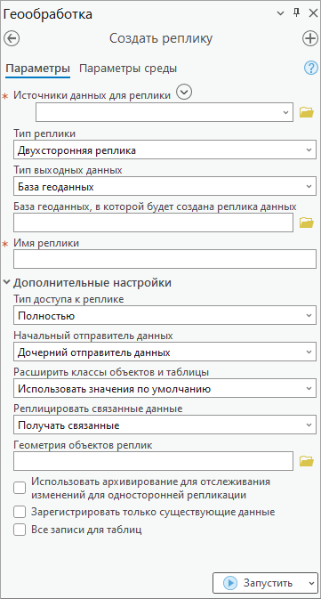 В следующих разделах описываются дополнительные настройки инструмента геообработки Создать реплику.