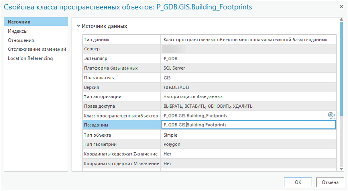 При создании таблицы или класса пространственных объектов в базе геоданных можно сразу присвоить им псевдоним. Псевдоним – это альтернативное название. Если присвоить псевдоним классу пространственных объектов или таблице, то именно под этим названием пользователи увидят их, добавив на карту. Пользователи могут увидеть имя таблицы или класса объектов на вкладке Источник в диалоговом окне Свойства класса объектов.