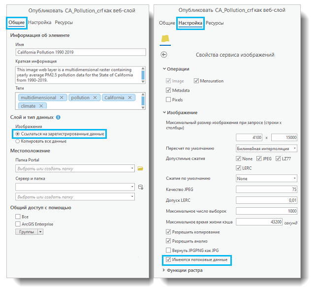 - И для наборов данных CRF, и для наборов данных мозаики —на вкладке Общие на панели Опубликовать как веб-слой задайте опцию Слой и тип данных как Ссылаться на зарегистрированные данные. Веб-слой будет создан со ссылкой на исходный набор данных.