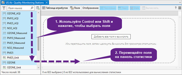 Для начала щелкните на поле на панели полей, нажмите Ctrl и щелкните, чтобы выбрать несколько полей по отдельности, либо нажмите Shift и щелкните, чтобы выбрать поля подряд. Затем перетащите поля на панели статистики.