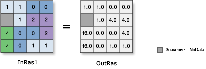 | Подпись | Описание | Тип данных | Выходной растр | Выходной растр. Значениями ячеек является результат возведения значений первых входных данных в степень значений вторых входных данных. | Raster |