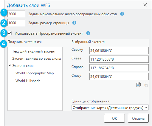 Диалоговое окно Добавить слой(и) WFS позволяет задать некоторые дополнительные свойства слоя, доступные для слоев WFS. Они включают в себя настройку максимального числа объектов и размера страницы, а также ограничение объектов областью интереса с помощью указания экстента. Вы также можете изменить эти свойства в диалоговом окне Свойства слоя WFS.