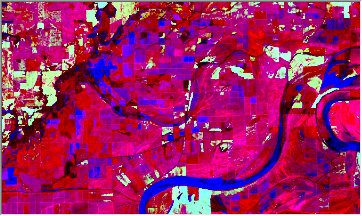 | 这是缨帽函数的前三个成分的 RGB 组合。 红色 = 亮度,绿色 = 植被量,蓝色 = 湿度。 |