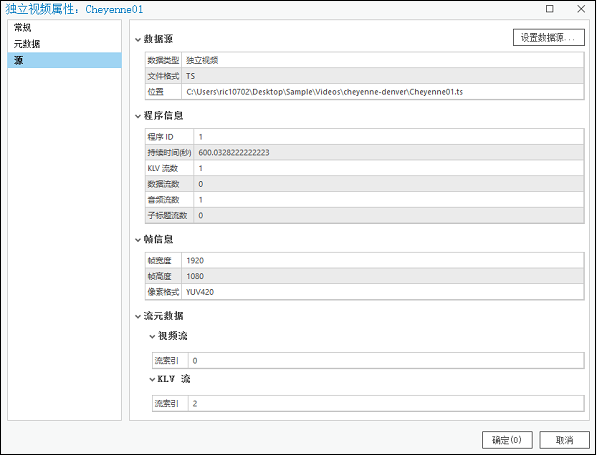 有关视频文件的详细信息,请右键单击内容窗格中的视频文件并选择属性。 针对数据源、程序信息、帧信息、流元数据-视频流和数据流项呈现关于视频文件的详细信息。
