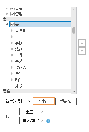 使用对话框右侧的箭头按钮来更改选项卡上的组顺序或自定义组中的命令顺序。 无法更改内置组中的命令顺序。