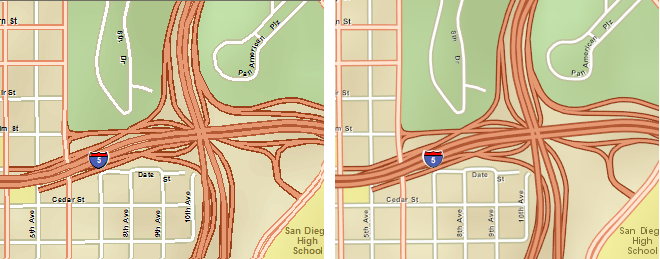 此绘制引擎与 ArcMap 中所使用的绘制引擎不同,在 ArcGIS AllSource 中绘制的地图导出时其外观存在一些重要差异。