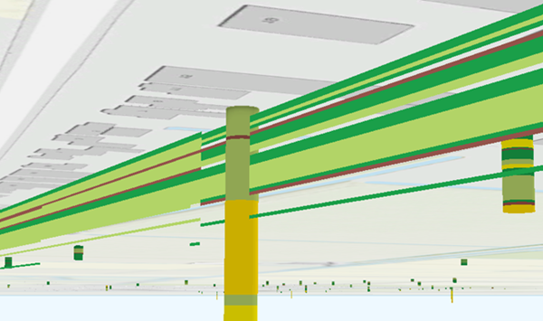 拉伸符号系统中的透明度功能可通过将其他值设为透明来强调特定值。 例如,要突出显示高污染浓度,可将较低的污染值设为透明。 使用等值面可以特定值来显示污染浓度。