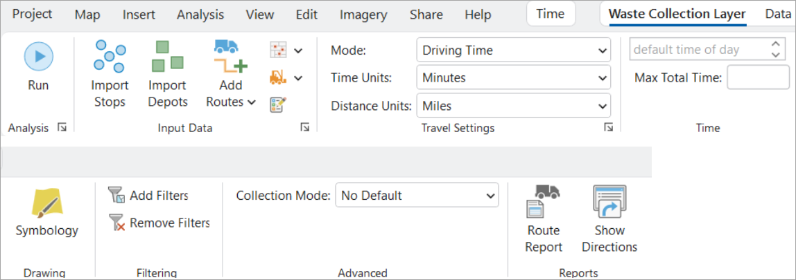 对于废弃物收集分析图层,仅显示包含基于时间的阻抗属性的出行模式。 出行模式还必须允许在死胡同掉头。时间单位