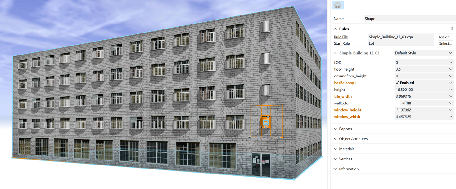 - 在 Simple_Building_LE_03.cga 规则文件中,添加一个属性以确定是否存在阳台。