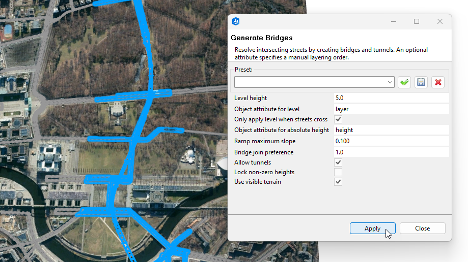 和简化图形工具是此工作流中最常用的工具。 这些工具为您提供了一种自动修复大多数街道问题的方法。 您可以在导入时启用其中一种工具,但如果希望有选择地将其应用于某些路段,也可以通过菜单来触发此过程。