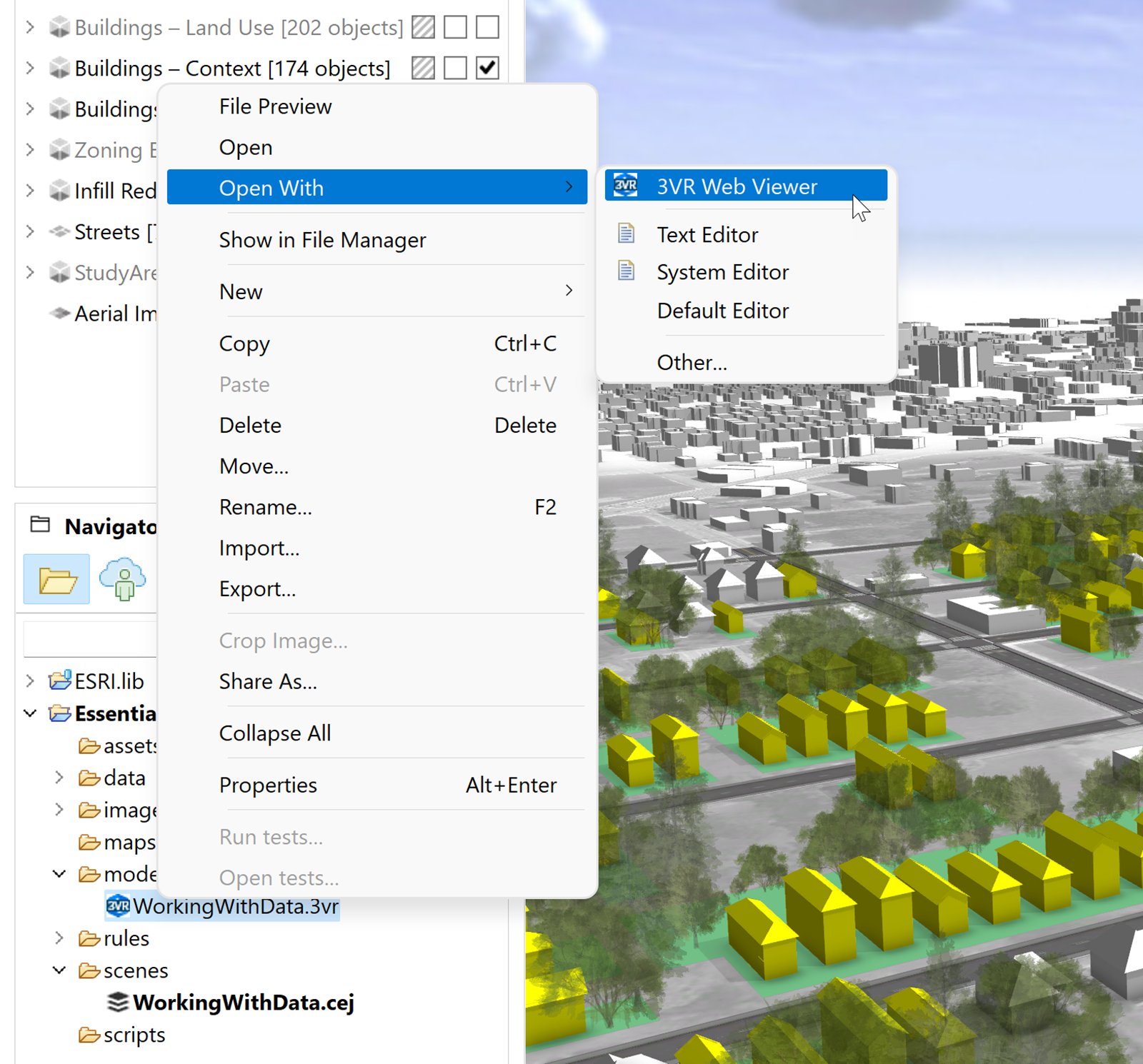 如果您接受默认位置,则 360 VR 体验将导出至 \models\ 文件夹。 在 Navigator 中右键单击文件,然后单击打开方式 > 3VR Web 查看器