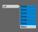 对于 selector 所选择的所有组件,使用 = 运算符都会得到一种新的形状。 在以上示例中,将为拉伸几何的六个 front 面创建一个 Front 形状。 因此,Lot 形状具有一个 Front 后继形状。 将相对于第一个选定 front 面设置枢轴和范围。