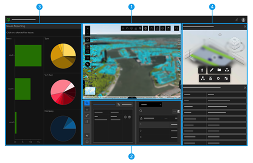 1 | “地图”微件位于应用程序的顶部。 它可以配置为在“地图”视图中显示 Web 地图,或在“场景”视图中显示 3D 地图。 |
